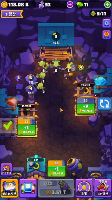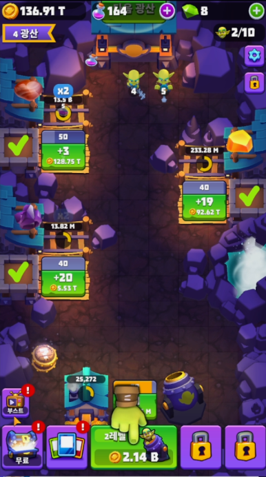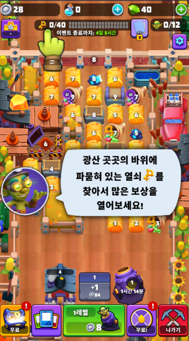 플레이 방식을 간단하게 요약하자면, 코인으로 고블린을 고용해서 광산의 돌들을 부셔서 다음 광산으로 가면 됩니다 .