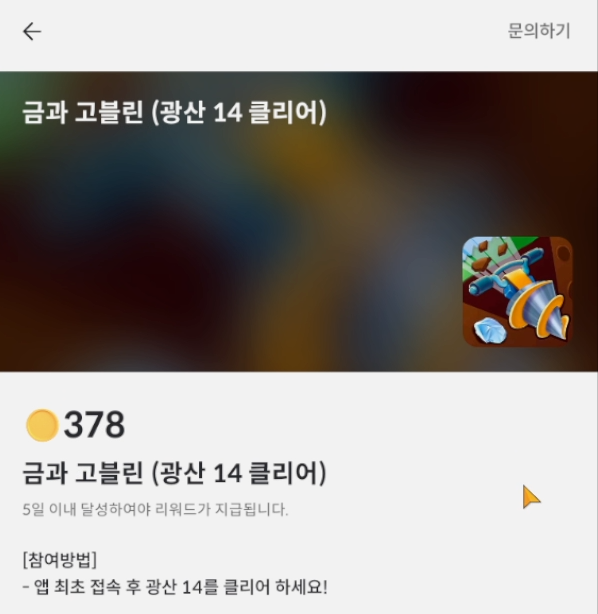 플레이 오라는 앱테크 어플에서 코인사냥 이벤트로 금과 고블린을 해보았습니다. 미션을 달성 하면 378코인을 준다고 하네요.